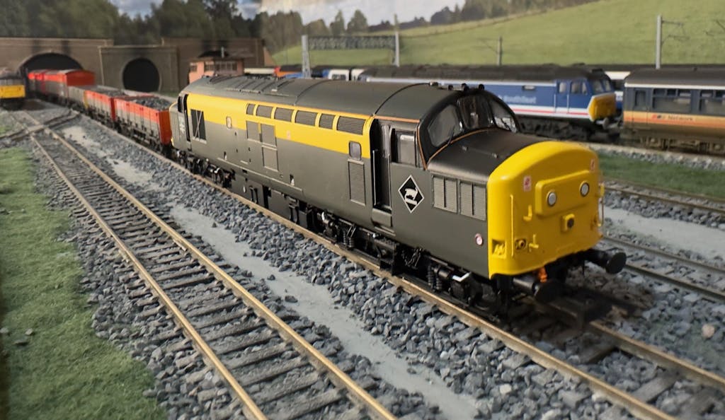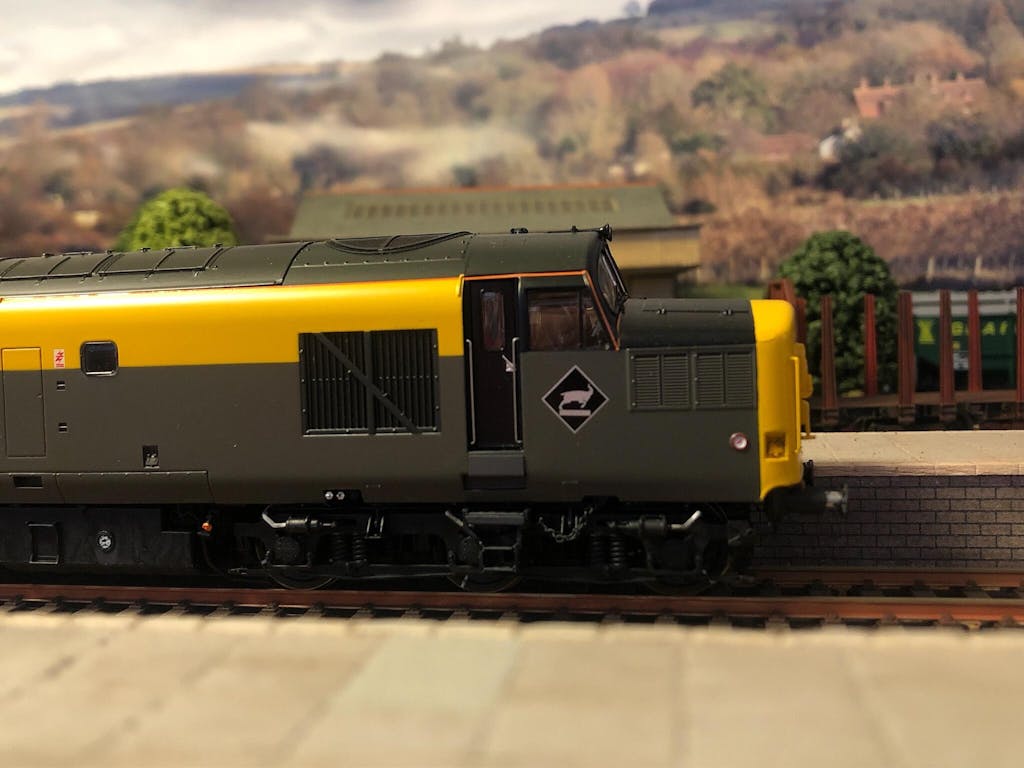 Repainted in the controversial general grey paint scheme in May 1990, like the majority of locomotives to gain this livery 37258 quickly swapped it for the 'Dutch' variant, being outshopped with the upper body yellow band in September 1991, also receiving a high visibility headlight, cast double arrows and Cardiff Canton depot plaques at the same time. Other distinctive spotting features include cast bogies and Western Region and standard lamp irons. Although wearing the colours of the civil engineer's department, the locomotive saw regular freight use as well as deputising on the Cardiff-Bristol Temple Meads-Weymouth summer dated services and passenger trains to the Glastonbury Festival throughout the 1990s. It lost its cast accoutrements in 1997 and was renumbered as 38384 the following year after being shod with a set of regeared CP7 bogies. It was eventually stored in 1999, still in 'Dutch' colours.