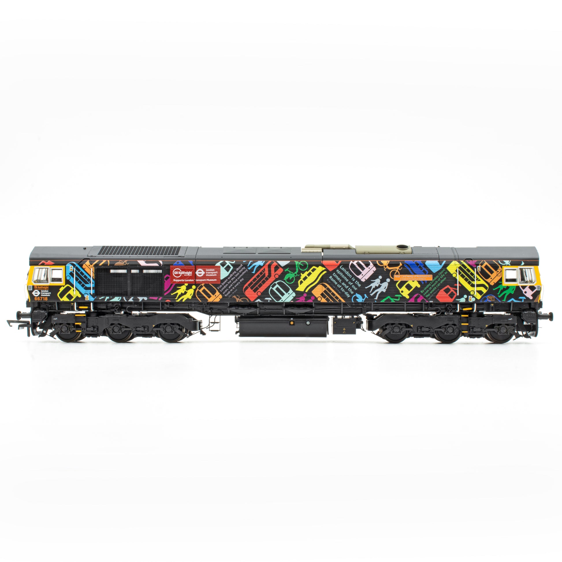 On 5 November 2013 the locomotive emerged from Arlington Fleet Services at Eastleigh Works in a striking new livery, one of a pair unveiled that day in partnership with the London Transport Museum. The design featured black bodywork covered with brightly coloured London Transport logos. At the same time the locomotive was renamed “Sir Peter Hendy CBE”, recognising the then Commissioner for Transport for London.