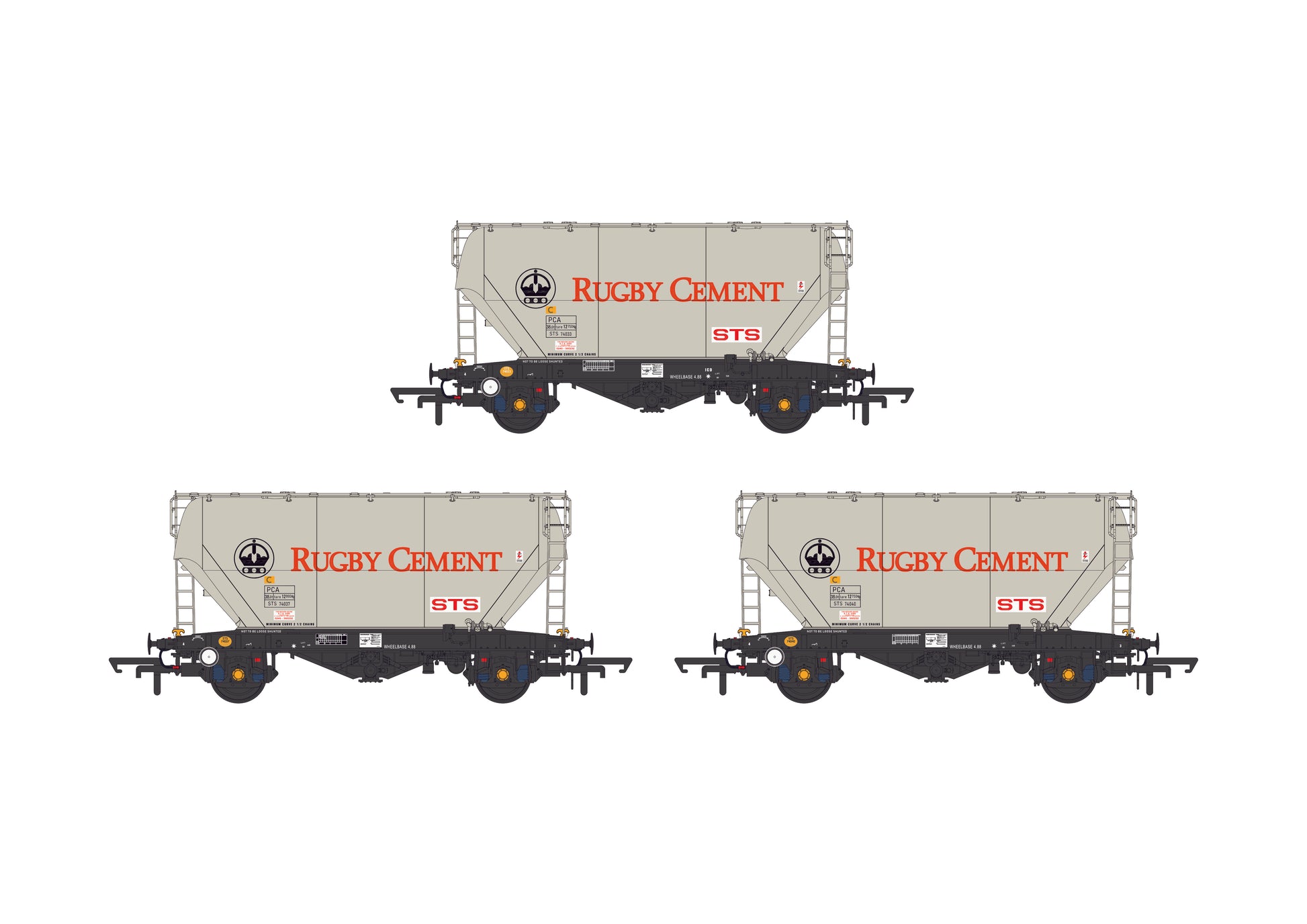 Built by CFMF of France for wagon leasing company STS (later VTG), the 50 PCA bulk cement wagons of the PC017B design diagram began entering service in 1982. A further batch of 15 wagons was manufactured in 1985 by another French firm, Fauvet-Girel, and assigned the PC017C design code. Companies such as Blue Circle and Rugby Cement have leased these vehicles during their time in traffic.